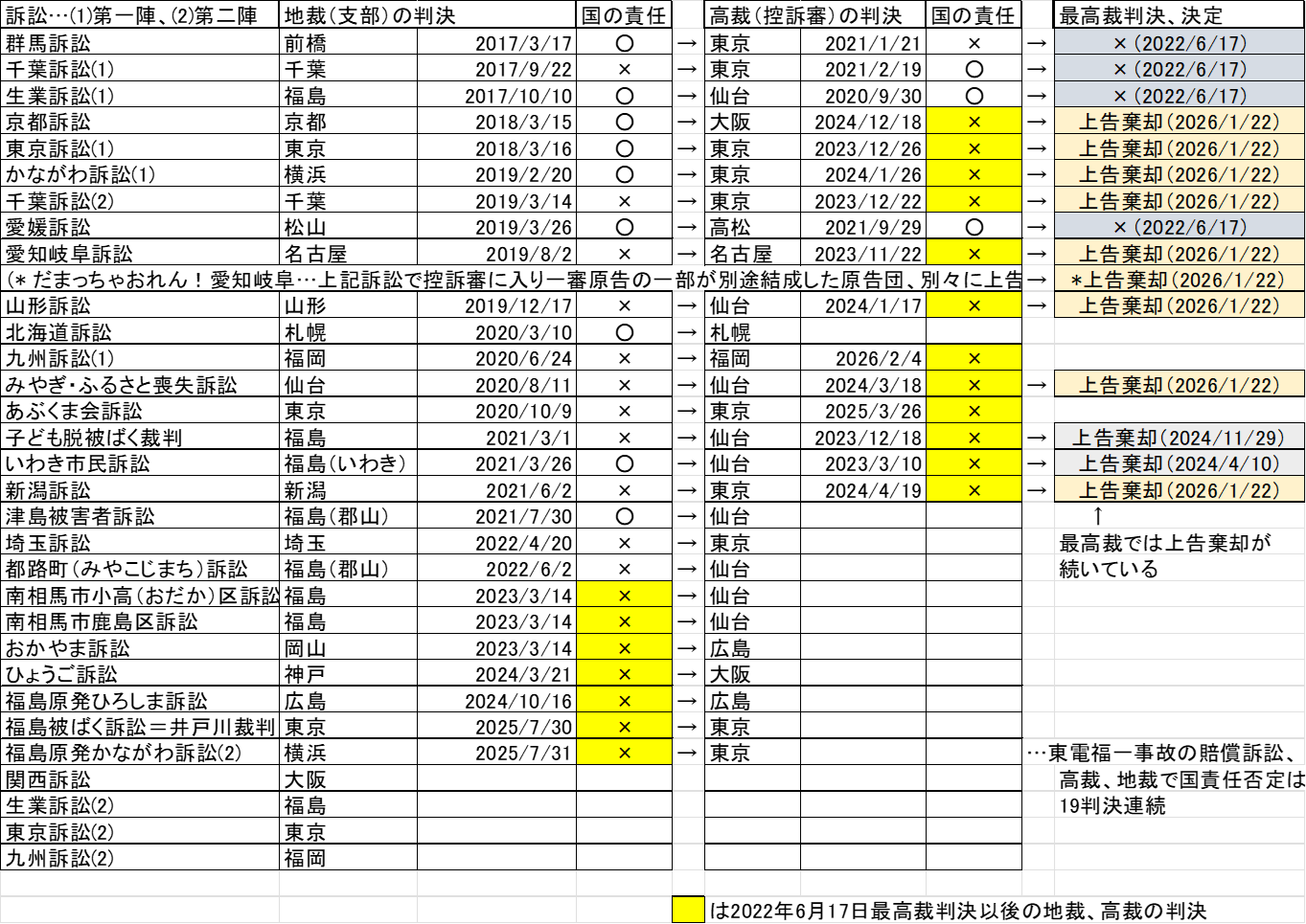 ぽかぽか通信(ぽかぽか★サポートチーム(原発賠償ひょうご訴訟)事務局発行)2026年3月号掲載記事 司法への信頼をつなぎとめるために原発賠償ひょうご訴訟控訴審で裁かれようとしているのは裁判所自体だと、大阪高裁の田中健治裁判長は理解しているだろうか? 三権分立のはずの司法の独立に疑問を持つ市民の司法への信頼は地に落ちている。2026年2月4日の九州訴訟(第1陣)の福岡高裁の不当判決で、2022年6月17日の最高裁判決以来の地裁高裁判決で国の責任については19連敗となった。国の責任を否定した高裁判決を不服として上告した京都訴訟など9訴訟について、最高裁は1月22日に上告棄却・不受理の決定を行っている。 そもそも2022年最高裁判決は、およそ3分の2を占める三浦判事の反対意見のほうが誰が読んでも説得力があり、多数意見は法律審である最高裁が下級審の事実認定を覆すというルール破りまで行って国を勝たせたものだった。 その多数意見を書いた裁判官は、国や東電の仕事を請け負っている大手法律事務所と縁のある原子力村の住民であることが明らかになった。くしくも2022年は原発回帰政策が顕著になった時期だった。 視点を転じてみると、トランプ大統領が国際法を無視した暴挙を繰り返し、日本でも小選挙区制度がもたらした数の横暴により平和憲法が危機に瀕している。これ以上、法の秩序が損なわれたら、法への信頼が損なわれたら一体社会はどうなってしまうのだろうか。 当然かもしれないが弁護団は法への希望を持って裁判所へ救いの手を差し伸べていることが、2月2日の口頭弁論を傍聴してよくわかった。仮に田中裁判長が上しか見ないヒラメ裁判官であったとしても、2022年最高裁判決に縛られることなく国の責任を認める判決を書けるように、あの手この手で最高裁判決にない論点で国の責任を攻めている。 裁かれようとしているのは裁判所自体だと裁判所に分からせるのは、裁判所の外の私たちの声だ。仲間内ではなく、より広く多くの人に理解してもらうことが今ほど求められている時はない。